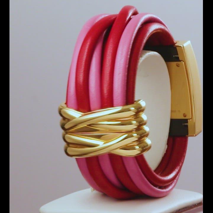 An essence of femininity and grace this gorgeous jewelry watch from de Grisogono features square case made of 18K rose gold set with lovely pink spinels boasting bezel set with the same gem in spectacular red and crown set with a black diamond stone while featuring 30m water resistance. The enchanting pink mother-of-pearl dial indicates hours and minutes with dauphine hands and is protected with anti-reflection sapphire crystal. The watch is worn on an exemplary red and pink leather strap secured on the wrist with an 18K rose gold deployment clasp. An essence of femininity and grace this gorgeous jewelry watch from de Grisogono features square case made of 18K rose gold set with lovely pink spinels boasting bezel set with the same gem in spectacular red and crown set with a black diamond stone.