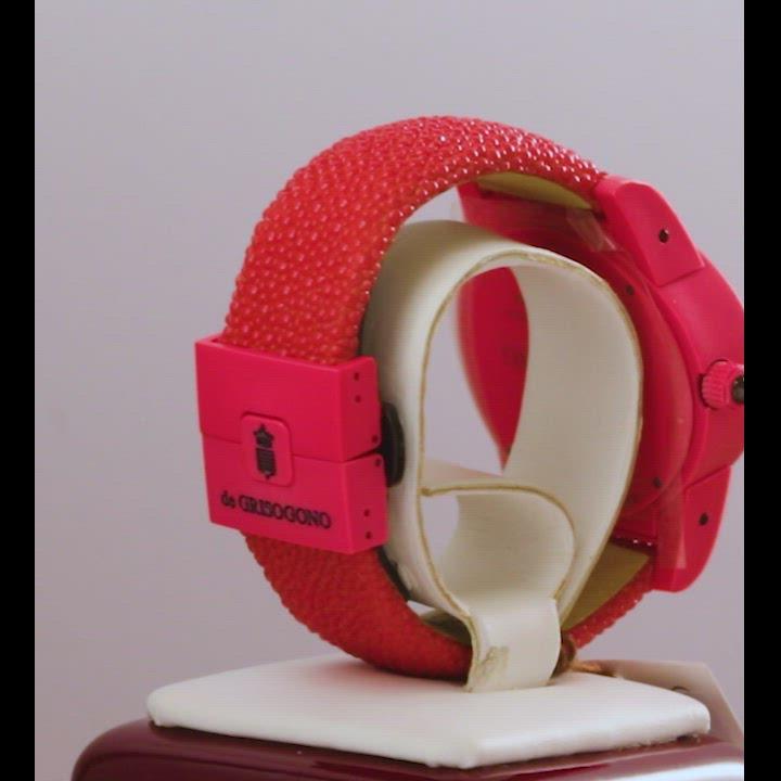 De Grisogono loves to experiment with design and functionality to create truly exceptional timepieces which are works of art. This particular model referred to as TONDO BY NIGHT S 08. The coral-red galuchat strap gives a ravishing look to the watch as well as to the owner. It dovetails perfectly with the dial- having a color combination of black accented with pink sapphires. The watch is made of pearly coral-red photoluminescent composite fiber glass a truly exceptional material which compliments the watch’s fiery color palette perfectly. De Grisogono loves to experiment with design and functionality to create truly exceptional timepieces which are works of art. This particular model referred to as TONDO BY NIGHT S 08. The coral-red galuchat strap gives a ravishing look to the watch as well as to the owner. It dovetails perfectly with the dial- having a color combination of black accented with pink sapphires. The watch is made of pearly coral-red photo luminescent composite fiber glass a truly exceptional material which compliments the watch’s fiery color palette perfectly.